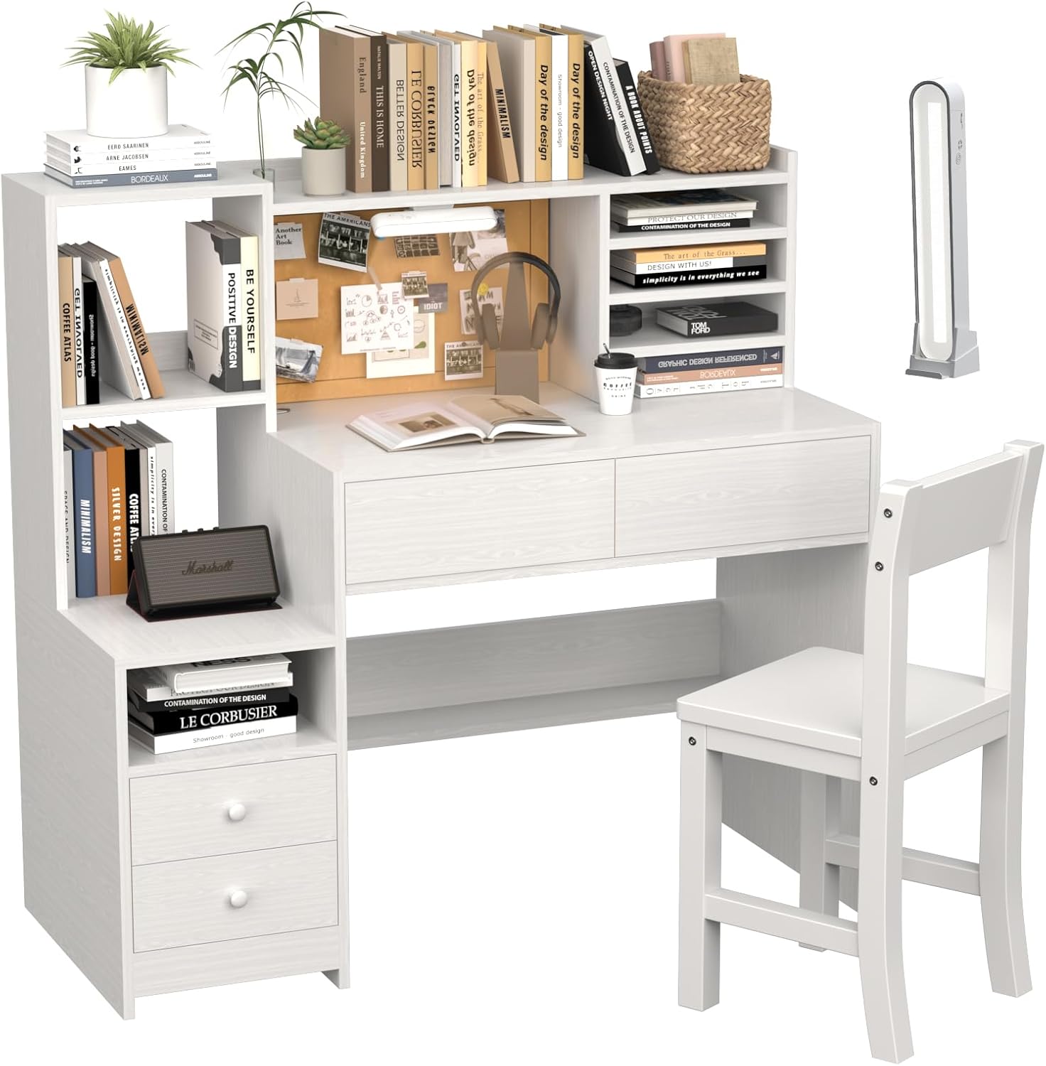White Wooden Kids Study Desk and Chair Set, Childrens Desk with Light, 4 Drawers,Storage Cabinets and Shelves, Boys & Girls Study Desk for Bedroom and Kidsroom